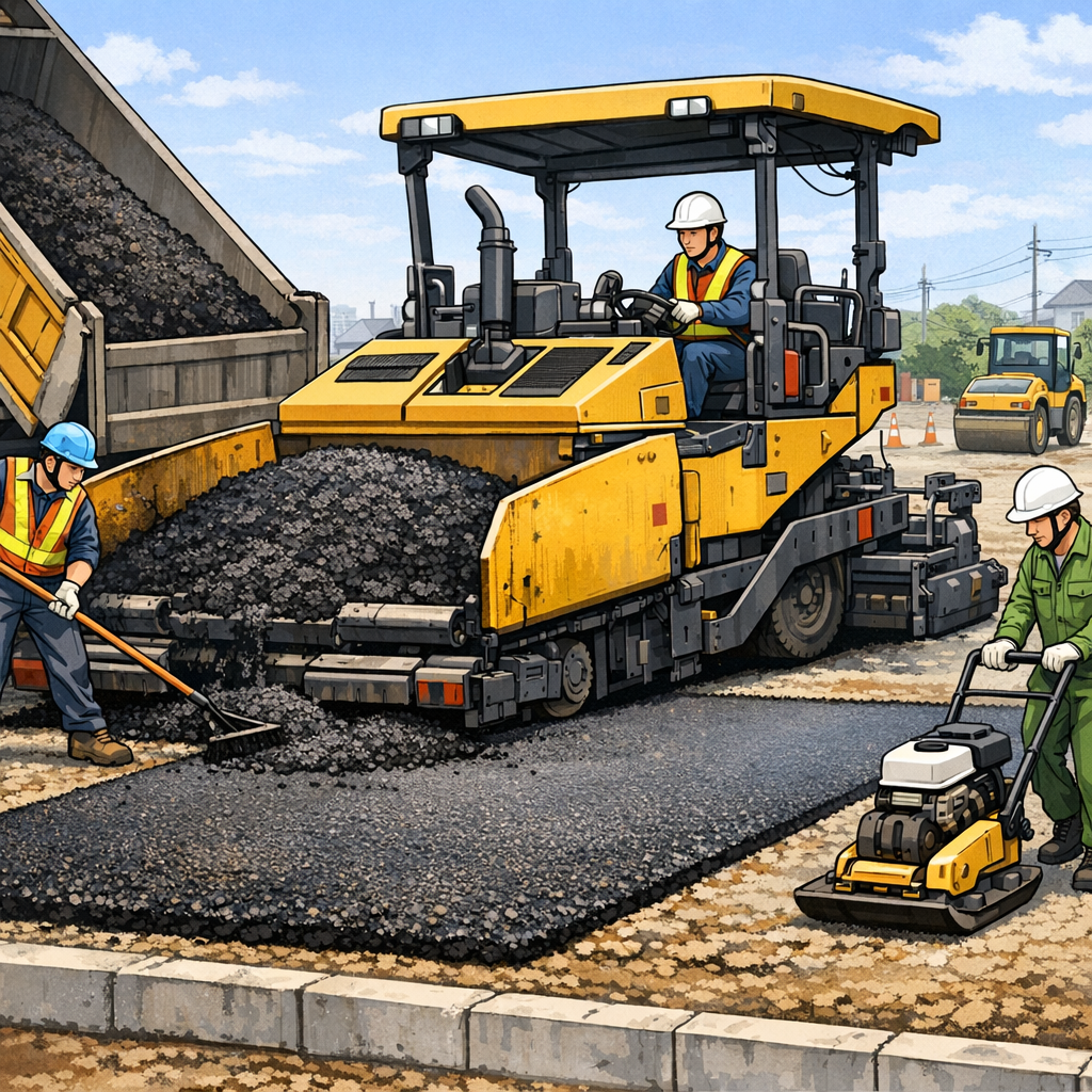 敷き均し作業では、厚さのばらつきや不陸(凹凸)が発生しないよう、熟練した作業員が重機操作と目視確認を行い、必要に応じて微調整を加えます。この工程の精度は、後工程となる転圧作業の仕上がりや、舗装の耐久性・平坦性に大きく影響するため、特に重要な工程のひとつです。