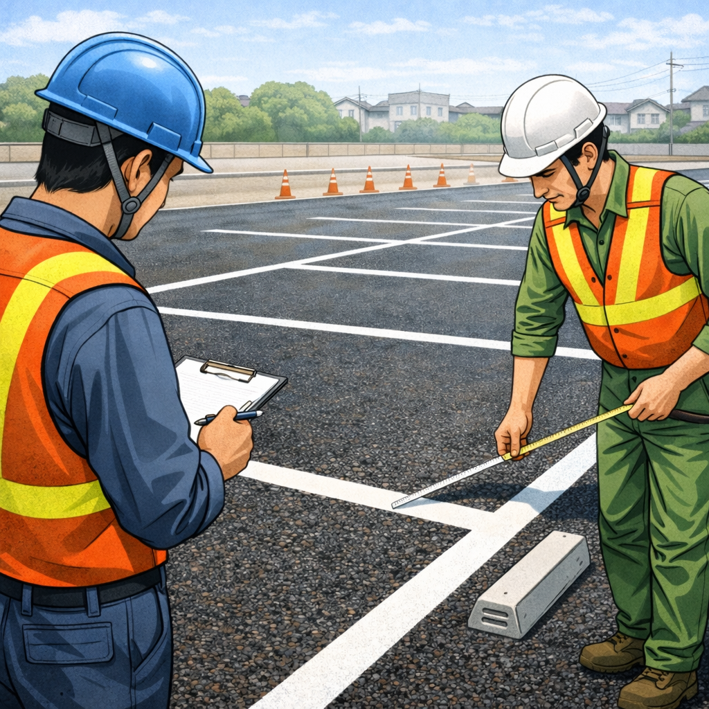 また区画線や駐車枠などのライン引きについても、位置・寸法・視認性を確認し、実際の利用を想定した仕上がりとなっているかを確認します。